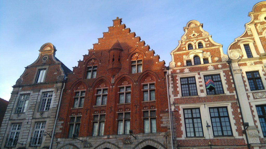 フランス北部のオー・ド・フランス地域圏にあるアラスの中心部にはグラン・プラス(Grand Place)という広場があります。フランス語で文字通り「大きな広場」という意味のこの広場にはバロック・フラマンド様式の建物が整然と並んでいます。その中で一つだけ違う建築様式の外観を持つのが、1467年に建てられた煉瓦造りの建物です(上の写真の左から2つ目)。ベルギーのブルージュなどでよく見られる屋根の妻側(三角の部分)が階段状になっているのが特徴で、アラスで現存するもので一番古い建物でもあります。