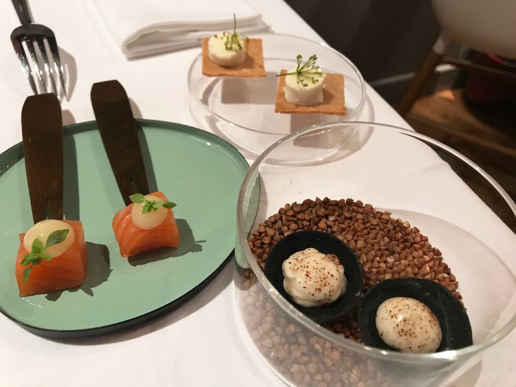 今回私はランチの時間にお邪魔したのですが、前菜・メイン料理・デザート(それぞれ2種類から選ぶことができる)に加え、食前の軽いおつまみと食後のコーヒーのお供のお菓子がついたメニューで32ユーロでした。ちなみに、ディナーは前菜・メイン料理・デザートのメニューで55ユーロ、6品の色々な料理が楽しめるコースで70ユーロとなっています(それぞれ2019年10月現在)