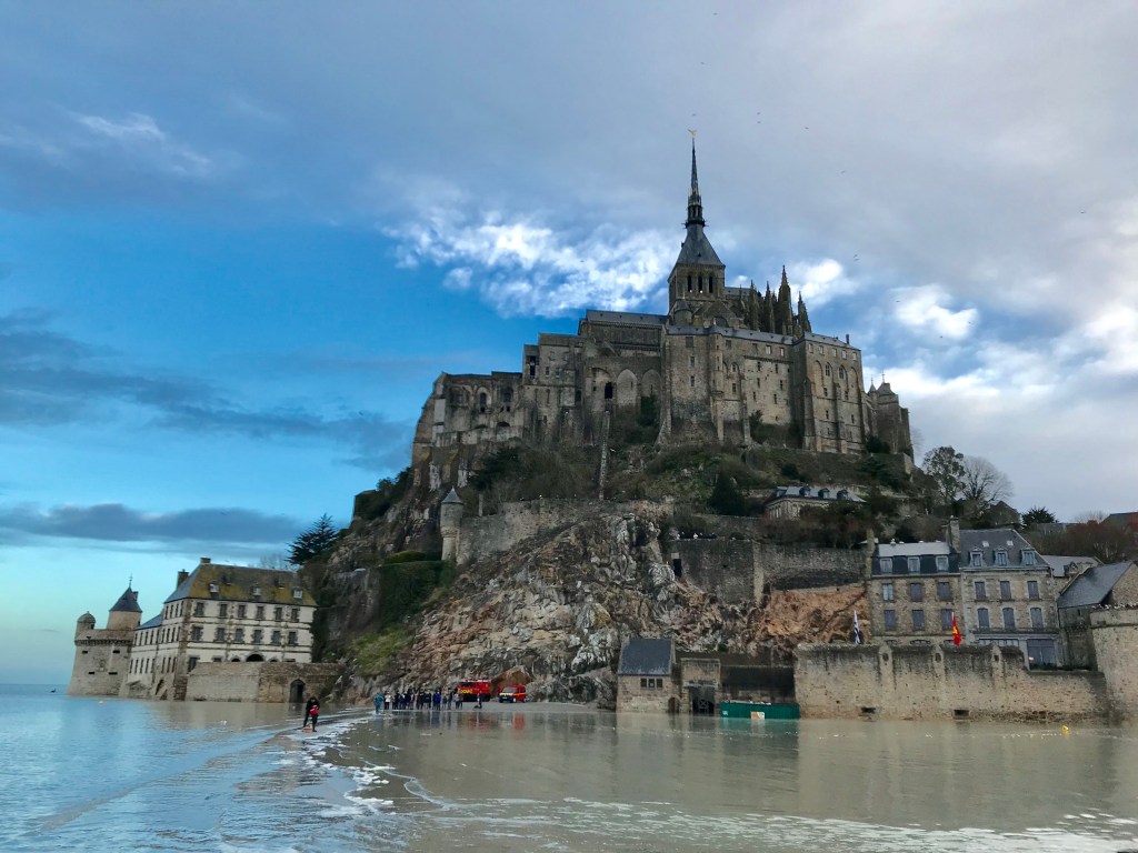 モン・サン・ミッシェルというと海の上の浮かぶ島のイメージがありますが、その姿は一年中見られるわけではありません。潮の満ち引きの規模は日によっても大きく異なるので、満潮でも島の対岸側には干潟が残っているということもよくあります。